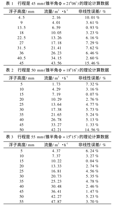 爲(wèi)了研究浮子流(liu)量計的非線性(xìng)問題,本文利用(yòng)公式(1)針對浮子(zǐ)在錐管中的垂(chui)直位置和流量(liang)的對應關系🏒給(gěi)出了三組理論(lùn)計算數據.