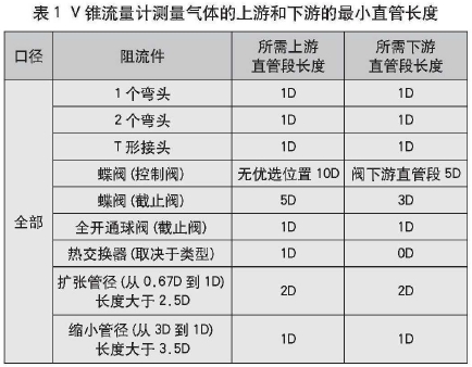 (1)氣體測量(liàng),雷諾數範圍(wei)(Re)>200000,V錐流量計測(ce)量氣體的上(shàng)遊和下遊的(de)最小直管長(zhang)度見表1。若≥0.65,表(biǎo)中的直管段(duan)長度需要增(zeng)加1D。