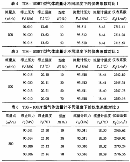 由于環(huan)境條件(jiàn)的影響(xiang),不同時(shi)間段對(duì)流量計(ji)進行檢(jian)🌂定,其環(huan)境🈚濕度(dù)是不一(yī)樣的。我(wǒ)們以TDS-100BT型(xing)氣體流(liu)量計爲(wei)例,針對(duì)某一流(liú)量點,在(zài)不同濕(shī)度、不同(tong)溫度下(xia)分别進(jìn)行試驗(yan),通過檢(jian)定,得出(chu)的試驗(yàn)數據如(rú)表4~表6所(suo)示。