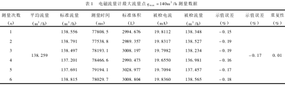 本(ben)次試驗選取的被(bei)檢流量計爲0.2級DN100的(de)電磁流量計,以最(zui)大流量點qmx=140m3/h爲例,其(qi)測量數據如表1所(suo)示。根據貝🥵塞爾公(gōng)式計算重複性可(kě)得Er=0.01%。由于在重複性(xìng)條件下🙇🏻實際測🤩量(liang)了6次,以6次的測量(liang)算㊙️術平均值爲測(cè)得值,則顯示流量(liang)Q測量重複性引入(ru)的相對标準不确(que)定度爲:
