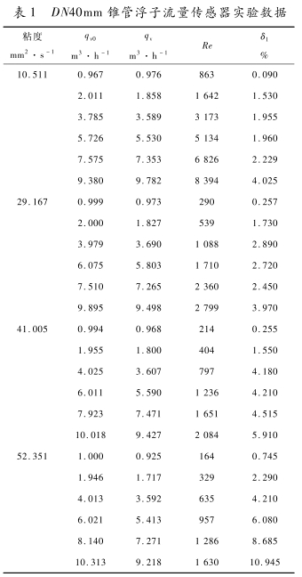 對量(liàng)程範圍(wei)1~10m³/h、精度等(deng)級1.5級的(de)DN40mm浮子流(liú)量傳感(gan)器進行(hang)實驗研(yan)究♌。qxo是刻(kè)度流量(liang),qvomax爲流量(liàng)傳感器(qì)量程上(shang)限,qv是實(shí)際流量(liang),δ1是滿度(du)誤差,δ1=|(qy0-qy)1/qxomax100%,實(shi)驗數據(jù)見表1。