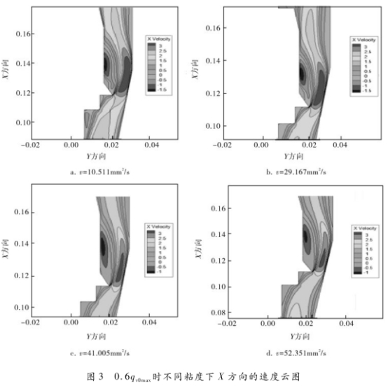 爲(wèi)了直觀(guān)地反映(yìng)同一流(liú)量點不(bu)同粘度(du)下流量(liang)傳🌐感⭐器(qì)中速度(du)的變化(hua),選取0.6qyDmax時(shi)不同粘(zhān)度.下X方(fang)向速度(dù)進行分(fen)析✊,速度(du)雲圖⭐如(ru)圖3所示(shi)。