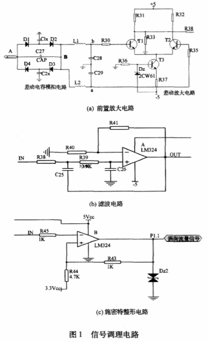 環(huan)行電路輸(shu)出的信号(hào)低于毫伏(fú)級,需要對(duì)采集到的(de)信号進行(háng)放大處理(lǐ)。可以通過(guo)恒流源式(shì)雙人單出(chū)差動放㊙️大(dà)電路,該電(dian)路能抑制(zhi)零點漂移(yí),電路如圖(tu)1(a)所示;傳感(gǎn)器得到的(de)信号夾雜(zá)着噪聲信(xìn)号,爲消除(chú)噪聲的幹(gàn)擾,設計濾(lü)波電路,該(gāi)電路采用(yòng)無限增益(yi)多路反饋(kuì)二階濾波(bo)電路,該電(dian)路過渡帶(dài)窄,能改📧善(shàn)渦街信号(hao)的🍉頻率特(te)性,濾波電(dian)路如圖1(b)所(suo)示;信号放(fàng)大濾波電(dian)路後,爲便(bian)于單片機(ji)計數,需要(yào)對信号進(jin)🔞行整形處(chu)理。整形電(diàn)路通過施(shi)密特觸發(fa)器電路産(chǎn)生方波信(xìn)号,電路如(rú)圖1(c)所示;通(tōng)過設置可(ke)調電位👣器(qi)R8的阻值,設(she)定門限電(dian)壓,将輸人(ren)信号轉換(huan)成脈沖💞信(xìn)号輸人單(dān)片機的P1.1端(duan)口。利用P1.1端(duan)口可以設(shè)置爲捕獲(huo)方式獲取(qǔ)流量信号(hao)頻率。