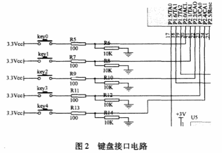 現(xian)場測量儀(yí)表在使用(yong)時,需要根(gēn)據不同管(guan)道直徑、流(liú)體介質、溫(wen)🔴度、氣壓、黏(nian)滞系數等(deng)改變或修(xiū)正相關🔞參(can)數,來計算(suàn)體積流量(liàng)或質量流(liu)量,所以儀(yí)表必須有(you)可以💃現場(chang)修正的鍵(jiàn)盤。設計采(cai)用獨立式(shì)鍵盤來修(xiū)改相關參(can)數值,鍵盤(pan)電路主要(yào)利用MSP430單片(pian)機的I0端口(kou)來進行設(shè)👈計。它的6組(zu)端口的每(měi)組8個IV0管腳(jiǎo)可以單獨(dú)設置成輸(shū)人💛或者輸(shu)出,且每個(gè)都可獨立(li)讀✂️寫。如🔴圖(tu)2所示爲鍵(jiàn)盤接口電(dian)路,,利用P2端(duan)口的每個(ge)管腳還可(ke)以單獨設(shè)置爲中斷(duan)或隻讀口(kǒu)分别與P2.0~P2.4依(yī)次連接。按(an)鍵功能分(fèn)别是返回(hui)鍵、右移鍵(jiàn)、增1鍵、左移(yi)鍵、修改鍵(jian)。當修改鍵(jiàn)有按鍵動(dong)作時觸發(fa)鍵盤中斷(duan),其它鍵按(àn)下不響應(yīng)中斷。當進(jin)人中斷後(hou)按下其它(tā)任意鍵🐪使(shǐ)得對應,P2口(kǒu)由100Q和1kn兩個(gè)電阻對3.3V分(fèn)壓爲高電(diàn)平3V,彈起鍵(jian)時對應P2口(kǒu)爲低電平(ping)0,以此作爲(wèi)鍵盤🏒掃描(miáo)判斷。