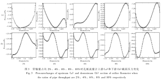 由圖3可(kě)知,一開始(shǐ),天然氣回(hui)流工況明(míng)顯,通過孔(kǒng)闆流👅量計(jì)的天然氣(qi)流量很小(xiao),流速很低(dī),導緻孔闆(pan)流量計上(shàng)下遊截面(miàn)處📐形成渦(wō)旋,壓力變(bian)化幅度較(jiao)大,流動極(jí)不均勻。當(dang)管輸量爲(wei)2%時,孔闆流(liu)量計上下(xia)遊截面壓(yā)力随軸線(xian)距離變化(hua)程度尤爲(wei)劇烈。随着(zhe)管輸量逐(zhu)漸增加,孔(kǒng)闆處的流(liú)動逐漸變(bian)得較爲均(jun)勻,但仍然(ran)受到上遊(yóu)回流渦旋(xuán)的影響,直(zhi)接導緻孔(kong)闆流量計(jì)入口和出(chū)口截面壓(yā)力随軸線(xiàn)距離變化(huà)幅度較大(da)。當流量接(jiē)近🐕臨界值(zhi)時,孔闆處(chù)的♍流動逐(zhú)漸變得均(jun1)勻☎️,孔闆流(liu)量計入口(kou)和出口截(jie)面的壓力(lì)變化幅度(dù)較爲穩定(ding),幾乎不受(shou),上遊回流(liu)渦旋的影(ying)響♻️。