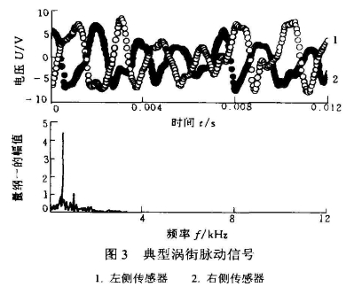 典型的渦(wō)街脈動信号如(ru)圖3所示。從信号(hao)的時域信号可(kě)以看出。對稱于(yú)後鈍體兩側渦(wō)街的脈動是反(fǎn)相的,并有明顯(xiǎn)的周期性👈,其功(gong)率譜的頻率分(fen)布很廣并有一(yī)個明顯的峰值(zhí),該峰👉值處頻率(lü)和時域信号的(de)主波動是頻率(lü)是相同的。定義(yì)功率譜中該峰(feng)值處的頻率爲(wèi)渦街的主🔴頻。下(xia)面所讨💛論的渦(wo)街頻率指的就(jiù)是渦街的主頻(pín)。