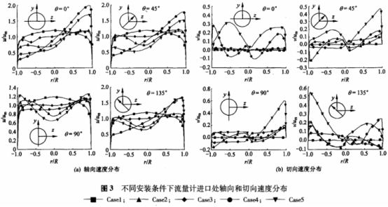 圖3示出了(le)不同條件下(xia)渦輪流量計(ji)進口處在4個(gè)方🔴向上🏒的軸(zhóu)向和切向流(liú)速分布。從圖(tu)中可以看到(dao),對于Casel這種管(guǎn)線結構,軸向(xiàng)流速符合充(chōng)分發展流的(de)速度分布,切(qie)向流☔速分量(liàng)⛱️很小。而且在(zài)進口橫截面(mian)上🔞,根據式(1)~(3)計(ji)算得到Ku0等🙇🏻于(yu)0.62,Kv和KA分别等于(yu)0,因此可作爲(wèi)參考量用于(yú)其它管線結(jié)構✍️的分析。本(ben)文對所有計(jì)算結果的分(fen)析都以此作(zuò)爲參考📧進行(háng)的。