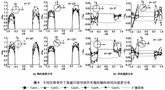 造(zao)成這種差别(bié)主要是由于(yu)對于Case4,流體通(tōng)過半圓薄闆(pan)後産生的漩(xuán)渦方向和通(tong)過彎頭後産(chan)生的漩渦💃方(fāng)向相同,因此(ci)在流量計🤩進(jin)口前表現出(chu)比Case3更高的切(qie)向流速分量(liang),而Case5的情況則(zé)反之。由于這(zhe)個原因,Case4計算(suàn)得到的❓渦輪(lun)流量計儀表(biǎo)系數與Casel相比(bi),其誤差偏移(yi)爲-1.79%,而CaseS則僅爲(wèi)-0.23%,見表1。這個🔴計(ji)算結果同時(shi)說明了在渦(wō)輪流量計前(qian)合理布置彎(wān)頭和閥i]開度(du)之間的相對(dui)方向,有助于(yu)降🏒低漩渦流(liú)的強度,從而(er)減少對流量(liàng)計量性能的(de)影響👄。同樣我(wo)們研究了流(liú)體通過前導(dǎo)流件後💃🏻在其(qi)輪毂末端處(chu)軸向流速和(hé)切向👄流速🐇的(de)分布情況,見(jian)圖4。