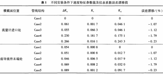 不同安(an)裝條件下在(zài)渦輪流量計(ji)進口和前導(dao)流件輪🐪毂末(mò)端兩個橫截(jié)面上Ku、Kv、KA、以及流(liú)量計儀表系(xì)數誤差偏移(yi)的計算值見(jian)表1。