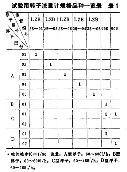 - 試驗(yan)用轉子(zǐ)流量計(ji)的規格(ge)品種見(jiàn)表1。