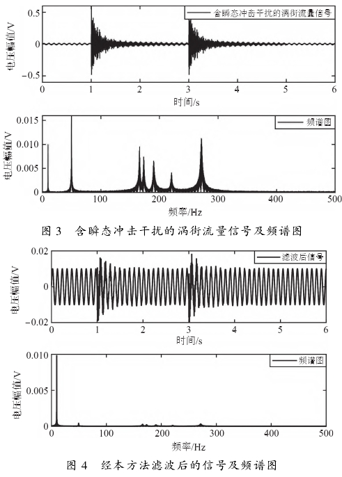 首(shou)先,驗證本方(fāng)法對瞬态沖(chòng)擊的濾波效(xiào)果。渦街信号(hào)仿真模型的(de)采樣頻率爲(wèi)10kHz、采樣時間爲(wèi)6s,加入兩次瞬(shùn)态振動幹擾(rao),管道直徑分(fen)别爲25mm;和50mm,流體(tǐ)介質爲氣體(tǐ)和液體。以管(guan)徑爲25mm、頻率爲(wèi)9.54Hz的液體介質(zhì)信号爲例,含(hán)有瞬态沖擊(ji)幹擾的渦街(jie)流量信号波(bo)形及其頻譜(pǔ)圖如圖3所示(shi)經過本方法(fa)處理後的波(bo)形及頻譜圖(tu)如圖4所示。從(cóng)圖3和圖4中可(kě)以看出,瞬态(tài)沖擊幹擾被(bei)有效濾除了(le)。