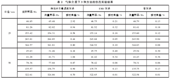 将(jiang)本方法與傳(chuán)統卡爾曼濾(lǜ)波方法、經驗(yan)模态分解方(fang)法(EMD方法)進行(háng)仿真實驗對(duì)比,在液體介(jie)質中的仿真(zhen)實驗結果列(liè)于表1,在氣體(ti)介質中的仿(pang)真實驗結果(guo)列于表2。