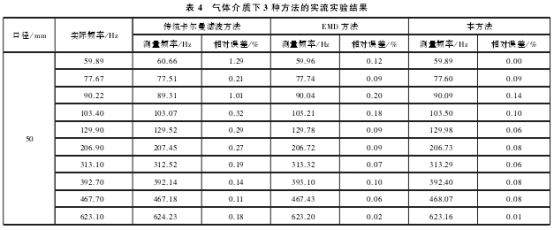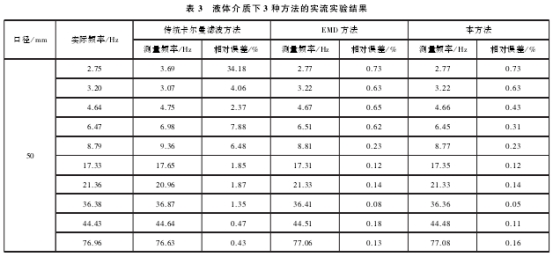 實流實驗(yàn)的管道口徑(jing)爲50mm,流體介質(zhi)爲氣體和液(yè)體,采樣頻率(lǜ)爲10kHz,采樣時間(jian)爲6s。每組實驗(yàn)選取10個流量(liang)點,主要是受(shou)噪聲影響較(jiao)大的低流速(su)信号。表3和表(biao)4分别爲管徑(jìng)爲50mm液體和50mm氣(qi)體的3種方法(fa)的處理結果(guo),其中實際頻(pín)率爲标定裝(zhuang)置上标準表(biao)的信号頻率(lǜ)。