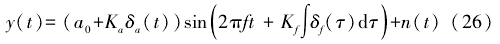 式中:α0爲渦(wo)街信号幅值(zhí);f爲渦街信号(hào)頻率;Kƒ、Kα分别爲(wèi)調頻靈敏度(du)和調幅靈敏(mǐn)度,K,爲渦街信(xin)号頻率與采(cai)樣頻率的比(bǐ)值,設Kα=1;δα(t)和δƒ(t)分别(bie)爲高斯白噪(zào)聲和渦街信(xin)号幅度和頻(pín)率的波動偏(pian)差;n(t)爲其他噪(zào)聲幹擾,包括(kuo)低頻振蕩幹(gàn)擾、工頻幹擾(rǎo)、周期振動幹(gan)擾和随機幹(gan)擾。