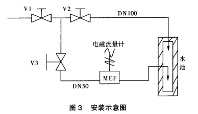電(dian)磁流量計(ji)安裝在一(yī)根DN50mm的管道(dao)上,原供水(shuǐ)管爲φ108mm,将其(qi)☔作爲旁通(tōng)用途。正常(chang)情況時,打(da)開V1、V3閥,關閉(bi)V2閥,補充水(shui)通過電磁(ci)流量計計(ji)量🤩後向蓄(xu)水池供水(shuǐ)。當電磁流(liu)量計故障(zhang)或者檢修(xiu)🐪時,關閉V3閥(fa),打開V1、V2閥向(xiàng)蓄水池供(gòng)水,以保📞證(zheng)生産不受(shou)影響,還可(ke)以方便電(diàn)磁流量計(ji)的零點校(xiào)🔴驗。安裝示(shi)意圖見圖(tu)3。