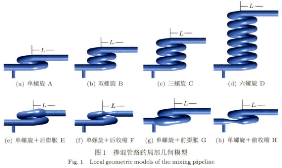 爲研究管(guǎn)路結構對摻(chān)氫天然氣摻(chan)混狀态影響(xiang),本文在🔴單👌螺(luo)旋管摻混管(guǎn)路的基礎上(shàng),使用Design.modeler構建了(le)8種🌈摻混管路(lu)的3維模型👌,如(ru)圖1所示。摻混(hùn)管路分别爲(wei)不同匝數螺(luó)旋管📞(單螺旋(xuán)A型、雙螺旋B型(xíng)、三✨螺旋C型、六(liu)螺旋D型)和單(dan)螺旋管路📧結(jie)合變徑管路(lu)(單螺旋+後膨(péng)脹♌E型、單螺旋(xuán)+後收縮F型、單(dān)螺旋+前膨脹(zhang)G型、單螺旋+前(qián)收縮H型)。由于(yu)将密度較輕(qing)氫氣從底部(bu)充入天然♈氣(qì)管路能取得(dé)🆚較好的摻混(hun)效😘果,因此設(she)計從管路底(dǐ)部充入天然(ran)氣。具體參數(shù)設置爲:管路(lù)直💃🏻徑D=100mm,甲烷入(rù)口直徑爲1D,氫(qīng)🔴氣入口直徑(jìng)爲0.5D,出口直徑(jìng)爲1D,螺旋管曲(qu)率😍半徑爲2D。氫(qing)氣入口(支管(guǎn)軸線)距螺旋(xuan)管起📐始截面(mian)長度爲3D,多匝(za)螺旋管螺距(jù)爲1.5D。膨脹管長(zhang)度爲3D,膨脹管(guan)直徑最大處(chu)爲.1.5D;收縮管長(zhang)度爲3D,收縮管(guǎn)直徑最小處(chu)爲0.5D。爲使氣體(tǐ)充分摻混,将(jiang)下遊管路總(zǒng)長度設置爲(wèi)150D。在計算不同(tóng)匝數🔞螺旋管(guan)及單螺旋管(guan)路結合變徑(jing)管路結果時(shi),定義的長度(du)L是以螺⛹🏻♀️旋.管(guan)終止截面爲(wèi)起點。