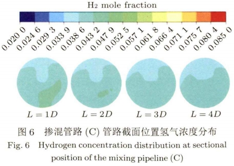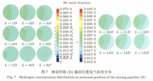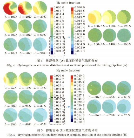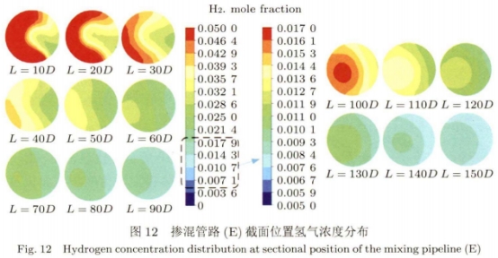 如(rú)圖4所示摻混(hùn)管路A在螺旋(xuan)管路出口處(chu)渦流作用非(fēi)常劇烈,其分(fèn)層現象明顯(xian)。且不同于--般(ban)氫氣的上😘下(xià)分層,摻混管(guǎn)路A中管道中(zhōng)的氫氣直存(cún)在左右分層(ceng),直至💜摻混距(jù)離在140D~150D達到摻(chan)混均勻,此時(shí)氫氣摩爾分(fèn)數均約爲0.8%。圖(tú)5所示摻混管(guan)路B的管路截(jié)面氫氣濃🐕度(dù)分布變化規(guī)律與圖4相似(sì),直至摻混距(ju)離在65D~70D達到🐅摻(chān)混均勻,氫氣(qì)基本不再分(fen)層🛀🏻,此時氫氣(qi)摩爾分數均(jun)約爲1.9%。而圖6所(suo)示🚶的摻混管(guan)路C在螺旋管(guǎn)道出口處💃就(jiu)已經基本達(dá)到摻☂️混.均勻(yun),氫氣已基本(ben)♈不存在分🔞層(céng),此時氫🔅氣摩(mó)爾分數均約(yuē)爲3.9%。相比摻混(hùn)管路C的三🤞匝(zā)螺旋管,圖7所(suǒ)示摻混管🛀路(lù)D增加到六匝(zā)螺旋的摻📧混(hùn)效果反而下(xià)降。螺旋管道(dao)出口氫氣分(fèn)層,直至摻🚶混(hun)15D時達到摻混(hùn)均勻,氫氣不(bú)再分層,此時(shi)氫氣摩爾分(fen)數約爲2.0%。
