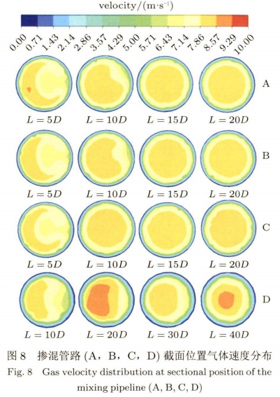 氣體摻混(hun)後速度分布(bu)雲圖如圖16所(suo)示。管道尺寸(cùn)的變化會導(dǎo)緻内部的氣(qì)體流動速度(dù)突變,使得氣(qì)體速度穩定(dìng)下來所需⭐的(de)距離更遠。摻(chān)混管路E,F,G,H均在(zai)約30D之後,速度(du)等高線形狀(zhuàng)穩定下來,比(bi)單螺旋管(15D)的(de)截面距離大(da)一倍。