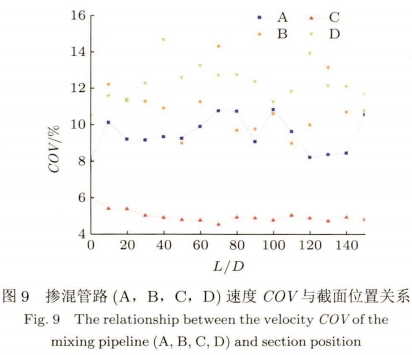 摻混管(guan)路(A,B,C,D)速度COV與截(jie)面位置的關(guān)系如圖9所示(shì)。随着截面💯位(wei)置向🚩下遊移(yi)動,摻混管路(lù)(A,B,D)的速度COV一直(zhi)處于波動狀(zhuang)态,但皆不超(chao)✌️過15%。相比于A,B和(he)D,摻混管路C内(nei)氣體♌速度分(fen)布更爲均勻(yun),其速度COV-直穩(wěn)定在5%左右。綜(zōng)合考慮氣體(tǐ)摻📱混均勻度(du)μ和速度COV,摻混(hun)管路C爲最佳(jia)摻混模型。