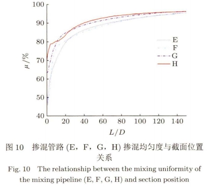 如(rú)圖10所示爲摻(chan)混管路(E,F,G,H)的管(guǎn)路内氣體摻(chān)混均勻度♉與(yu)截面位置關(guān)系,摻混管路(lu)E,F,G,H是在單螺旋(xuan)的基礎上❗添(tiān)加變徑管(膨(peng)脹管或收縮(suō)管),分别在136D,132D,107D,96D處(chù)時實現氣🔞體(tǐ)摻混均勻。相(xiang)比單螺旋管(guǎn)的146D,在不同位(wèi)置添加任何(hé)變徑管均能(neng)在.不同程度(dù).上實現縮短(duǎn)摻混距離的(de)效果。将變徑(jìng)管置于單螺(luo)旋管之前氣(qì)體初步摻混(hun)後再進入單(dan)螺旋管進一(yi)步摻混,明顯(xian)比置于單螺(luó)旋管之🏃♂️後更(geng)能👌有效地縮(suo)短摻混。而氣(qi)體進入收縮(suo)管内流動速(su)度會增大,此(ci)時的擾動更(geng)加劇烈,有助(zhu)于氣體摻混(hun)。針對變徑管(guǎn)位置及類型(xing),摻混管路🌈H(即(jí)前收縮.管)的(de)摻🈲混效果更(gèng)好。