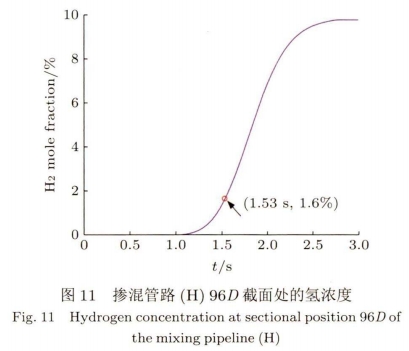 刻(ke)氫氣摩爾分(fen)數爲0,表示氫(qing)氣還沒擴散(sàn)至指定位置(zhi)。如圖11摻🍓混裝(zhuāng)置H爲最佳摻(chan)混模型,在96D截(jié)面處,氫氣摩(mó)爾分數💔随注(zhu)入時間,由0到(dào)9.8%的變化過程(chéng)。氫氣流動擴(kuò)散1.53s後,初次達(dá)到摻混均勻(yun)時,在96D截面㊙️處(chu)瞬時氫氣❗摩(mo)爾分數爲1.6%。天(tiān)然氣摻氫混(hun)摻管路E,F,G,H
