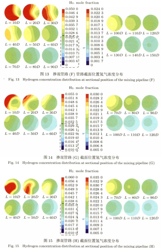 對(duì)比圖12~圖15,四種(zhong)類型摻混管(guan)路的管道截(jié)面氫氣濃度(du)變化規律很(hěn)相似。在螺旋(xuan)管道出口.處(chu)氫氣均存在(zai)明🧑🏽🤝🧑🏻顯的💔左右(you)分層現象。但(dàn)随着距離的(de)增加,最終均(jun1)能達到摻混(hun)⛹🏻♀️均勻,氫氣基(ji)本💛不再有分(fen)層的狀态。但(dan)不同類型管(guan)道達到此狀(zhuang)态🏃♂️所需的距(jù)離不一。如圖(tu)12所示摻混🔞管(guan)路E需約130D~140D的距(jù)離才能達到(dào)此狀态,此㊙️時(shí)氫氣摩爾分(fèn)數約爲0.9%;圖13所(suǒ)示的摻混管(guǎn)路F同樣需約(yue)130D~140D的距離達到(dao)此🐇狀态,此時(shi)氫氣摩爾分(fen)數比摻混管(guǎn)路E略大,約爲(wèi)1%;圖14所示的摻(chan)混管路G需約(yuē)100D~110D的距離達到(dao)此狀态,此時(shi)氫氣摩🌈爾分(fèn)數約爲1.2%;圖15所(suo)示的摻混🔆管(guan)路H需約90D~100D的距(ju)離達到此狀(zhuàng)态,此時氫氣(qi)摩爾分數🐉約(yuē)爲1.6%。