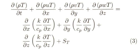 式中(zhōng),k爲流體傳熱(rè)系數,Cp爲比熱(rè)容,T爲溫度,St爲(wei)流體内熱源(yuan)和因黏性作(zuo)用流體機械(xie)能轉化爲熱(rè)能部分。