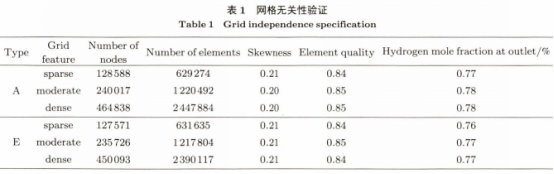 本文利用ANSYSWorkbench中(zhōng)的Mesh模塊,選用(yòng)四邊形或三(sān)角形網格法(fa)對流體域♊進(jìn)🏒行網.格劃分(fen)。網格數量對(dui)Fluent仿真計算結(jie)果有至關重(zhòng)要的影響。理(lǐ)論.上所采用(yong)的特征尺寸(cun)網格越小,得(dé)到的仿真結(jie)果越✍️正确。但(dan)👄随着網格數(shù)量的增加,對(duì)計算硬件資(zī)源的要求更(gèng)高🌂,而且導緻(zhi)計算時間延(yan)長,降低求解(jiě)結果的收斂(liǎn)性。本文以摻(chan)混管路A,E爲代(dai)表,分析稀疏(shu)、中等、稠密三(sān)種網格🌏特點(diǎn)對出口氫氣(qi)濃度變化的(de)影響,進行網(wang)格無關性驗(yan)❗證。結果如表(biao)1所示,随🔆網格(gé)數量增加,不(bu)同網格特點(diǎn)出口處氫氣(qi)摩爾分數波(bo)動很小。綜合(he)網格平均偏(pian)斜系數和網(wǎng)格平均質量(liàng)系數分析,三(san)種網格特點(dian)下的網格質(zhì)👅量均滿足模(mó)型需求,可以(yi)忽略網格對(dui)仿真計算結(jie)果精度的影(ying)響。