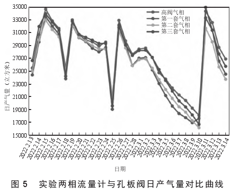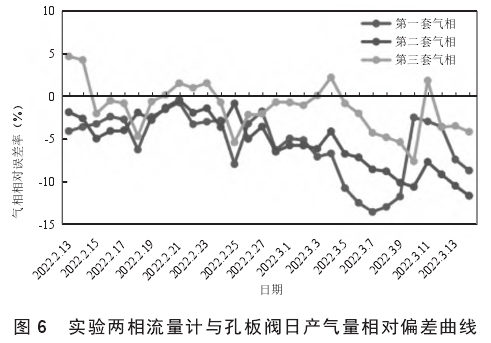 根(gēn)據實驗(yàn)結果(圖(tú)5和圖6),井(jing)口濕氣(qi)氣液兩(liǎng)相流量(liang)計相對(duì)偏差在(zai)土5%以内(nèi)的數據(ju)點占比(bǐ)最高,爲(wèi)90%,濕氣流(liú)量計、智(zhì)能差壓(yā)流量計(ji)與孔闆(pǎn)流量計(jì)日産氣(qì)量相對(dui)偏差在(zai)土5%以内(nèi)的數據(jù)點占比(bi)分别爲(wei)53%和47%。