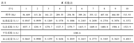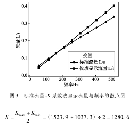 1)使用K系數法(fǎ)結果如表1所(suo)示,标準流量(liàng)、K系數法實際(ji)顯示流量與(yu)頻率的散點(diǎn)圖如圖3所示(shi)。