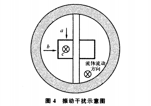 懸浮式(shì)結構對于流場(chǎng)中的振動幹擾(rao)噪聲可以實♍現(xiàn)有效的抑🏃♂️制.管(guan)道在外界幹擾(rǎo)作用下産生的(de)振動總是可以(yǐ)分解爲如圖4所(suǒ)示的三個方向(xiàng),即方向☁️a----與旋渦(wo)升力方向相同(tóng)👈、方向b----與🈲流體流(liú)動方向垂直、方(fāng)向c--與流體流動(dòng)方⛱️向平行.根據(ju)懸浮式差動傳(chuán)感器結構與安(an)裝方式,可知🔴方(fāng)向b與方向c上的(de)振動幹擾不會(hui)産生噪聲信号(hào),隻有方向a的振(zhèn)動幹擾可引起(qi)傳感器殼體的(de)跟随振動.此時(shi),由于傳感器中(zhong)金屬質量塊的(de)慣性作用,檢測(cè)單元中上下對(dui)稱的兩個壓電(diàn)陶瓷片會分别(bie)受到壓力和拉(la)力的作用,這使(shǐ)得兩個壓電陶(tao)瓷片分别産生(shēng)極性相反的正(zhèng)負電荷信号.由(you)㊙️于兩個壓電陶(tao)瓷片采用并聯(lian)結構,所🔅以當🌂上(shàng)下兩個壓電陶(táo)瓷片的信🌏号在(zai)金屬質量塊中(zhong)相加時,幹擾信(xìn)号所産生的電(dian)荷信号🏃♀️會相互(hu)抵消,傳感器起(qi)到了自減振的(de)作用,從而極大(da)地削🚶弱了此方(fāng)向的幹擾信号(hao).