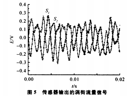 如圖3所示,當(dang)旋渦流經傳感(gan)器時,旋渦産生(sheng)的交變壓力💜作(zuò)用🚩在兩個檢測(cè)單元的彈性膜(mó)片上,使兩側的(de)壓電陶瓷片交(jiao)替産生📞電荷.兩(liang)個檢測單元會(hui)輸出帶有噪聲(sheng)的正弦信号Si與(yu)S2,如圖5所示.由于(yu)兩個檢🔅測單元(yuán)的對稱性,使🌈得(de)St與S2信号中所含(hán)的渦街流量🥵信(xin)号的幅值與頻(pin)率相同、相位相(xiàng)差180°;又因爲管道(dào)振😄動、流場脈動(dong)等引起的幹擾(rao)振動對兩側的(de)壓💰電陶瓷片的(de)作用是一🎯緻的(de),所以S1與S2信号中(zhong)所含幹擾信号(hào)爲幅值、頻率與(yu)相✔️位都相同的(de)共模❗信号.在采(cai)用差動式電荷(he)放大前置放大(dà)電路中,輸出信(xin)号隻含有差模(mo)信号S1-S2,從而有效(xiao)地抑制了振動(dòng)幹擾.