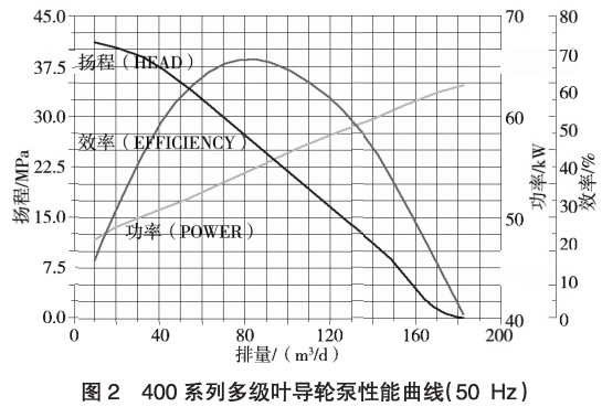 潛油電泵機組都(dou)遵循GB/T16750--2015《潛油電泵機(jī)組》,出庫的時候都(dou)🥵會進行♌泵🏃🏻性能測(ce)試,繪制泵性能曲(qǔ)線,也就是泵揚程(cheng)、排量、泵效、軸功率(lü)曲線”。要求至少采(cǎi)集13個點,即在不同(tong)排量下的壓力、泵(bèng)效、功🤩率數據,來給(gěi)定泵的有效高效(xiào)區間,用以指導.用(yong)戶生産。圖2爲50Hz工頻(pin)運行的數據曲線(xiàn),給定的高效區爲(wei)40~150m3/d。