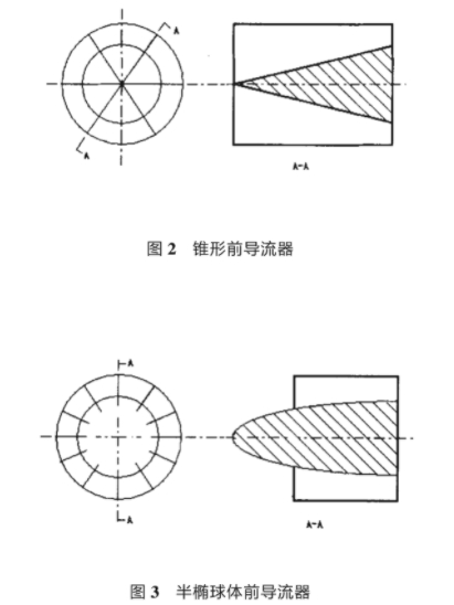 圖2和(hé)圖3分别爲兩(liang)種結構的前(qian)導流器示意(yi)圖。圖2爲渦輪(lun)流量計常用(yòng)結構,葉片數(shù)爲6導流.體形(xíng)狀由流入至(zhi)流出呈錐形(xing),葉🥵片長與錐(zhui)體高度相同(tóng).圖3爲本❤️文改(gǎi)進的前導流(liu)器結☎️構示意(yi)圖其主🐕要特(te)點是将錐體(ti)改爲半橢球(qiu)體,葉片數增(zeng)加到12并把葉(ye)片長度縮小(xiǎo)1/3.