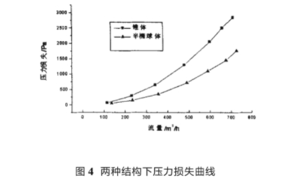 圖4是兩種結(jié)構下,流體經(jīng)過流量計後(hou)的壓力損失(shī)曲線。由圖4可(ke)看出在流量(liang)<100m³/h時,壓力損失(shī)不受導流器(qì)結構的影響(xiang)而且壓🧑🏾🤝🧑🏼損很(hen)小。随着流量(liang)增大,改進的(de)🐪導流器🏃🏻♂️的壓(yā)損明顯低㊙️于(yú)錐體導流器(qì)在最大流量(liang)🈲600m³/h處錐體的壓(yā)損約爲半橢(tuo)球體的2倍,可(kě)見導流器的(de)結構對流量(liàng)計壓力損失(shi)有不容忽視(shi)🏃🏻的影響作用(yong)。