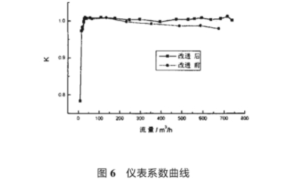 圖6爲分别(bié)采用錐體和(hé)半橢球體導(dao)流器,流量計(ji)儀♉表系數的(de)測試結果。由(you)圖可看出采(cai)用改進的導(dao)流器後🆚流量(liang)計儀♈表系數(shu)比改進前有(you)較好地改善(shan)在量程範圍(wei)内50m³/h~600m³/h),K很好地體(ti)現常系數的(de)特性甚至在(zài)超過最大量(liàng)程後能繼續(xu)保持水平直(zhí)線狀⛹🏻♀️态。改進(jìn)前的流量計(jì)K值也較好,但(dàn)随着流量增(zēng)大直線略向(xiàng)下♋傾斜偏離(lí)了🛀🏻水平位置(zhì)。