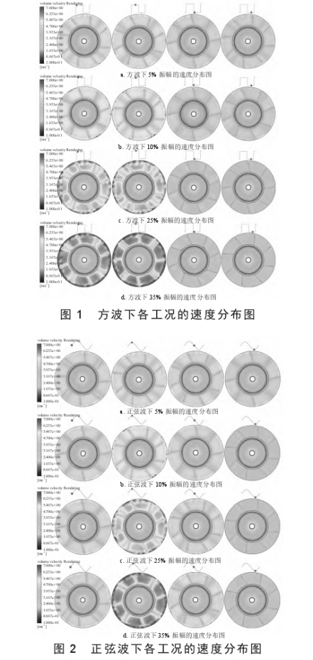 對比兩種波形(xíng)的速度分布圖(tu),同振幅下的波(bō)峰時,方波工況(kuàng)下流場速度略(lue)大于正弦波工(gōng)況,且方波的高(gāo)流速持續⛱️時間(jiān)比正弦波的高(gāo)流速持續時間(jian)長。