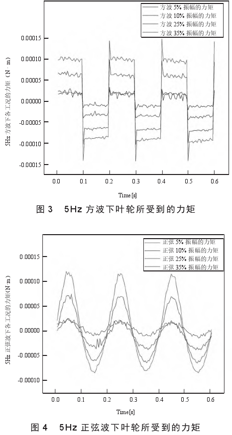 圖3~圖4分(fèn)别是5Hz時方波、正(zheng)弦波脈動流下(xià)葉輪,所受力矩(ju)。除🏒了流量突變(biàn)點外,葉輪所受(shou)力矩與流量波(bo)形近似。