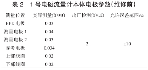 對測(cè)量傳感器(qi)本體絕緣(yuan)情況進行(háng)檢查,觀測(cè)絕緣阻值(zhi)是否正常(chang)、電極是否(fou)鏽蝕、線圈(quan)是否鏽斷(duan)。1号電.磁流(liu)量計本體(tǐ)電極參數(shu)見表2。