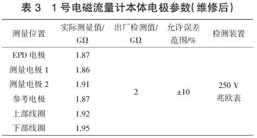 打開密(mi)封後,發現(xian)1号電極位(wei)置有進水(shuǐ)現象,導緻(zhi)電磁線圈(quan)和📧電極安(an)裝部位發(fa)生鏽蝕絕(jué)緣失效。對(dui)1号電極❗進(jin)行除鏽處(chu)理并壓緊(jin),對其他3個(gè)電極安裝(zhuang)環進行除(chú)鏽,同時更(geng)換所有連(lian)接👨❤️👨導線,再(zai)次測試電(diàn)磁流量計(ji)本體電極(jí)參數(表3)。