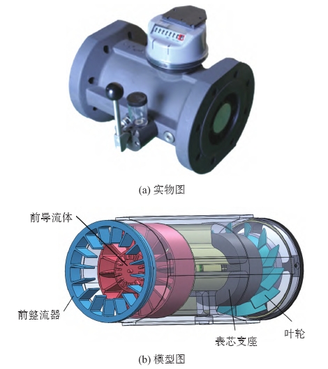 以氣體渦(wō)輪流量計爲(wei)研究對象,流(liú)量計的結構(gou)主要由前整(zheng)流器、前導流(liu)體、葉輪、表芯(xin)支座、後導流(liú)體以及殼體(ti)等組成,其物(wù)理模型如圖(tu)1所示。流量計(ji)的前整流器(qì)采用葉栅結(jie)構,葉栅數爲(wei)16;前導流體由(yóu)第二級16片葉(ye)栅(與前整流(liu)器葉栅呈11.5°夾(jiá)角)和80mm長的圓(yuan)柱結構組成(cheng);表芯支座用(yong)于固定葉輪(lún),葉輪的葉片(pian)數爲12,螺旋角(jiao)爲45°;後導流體(tǐ)置于葉輪之(zhi)後,用于穩定(dìng)出口處的氣(qì)流。