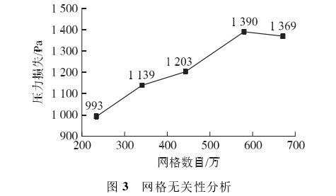 根據氣體渦(wō)輪流量計的(de)結構設計圖(tu)紙,運用SolidWorks軟件(jian)對各部分零(ling)件進行組裝(zhuang)建模,将建好(hǎo)的模型導入(ru)ANSYSWorkBench進行網格劃(huà)分。采用分塊(kuài)化方法劃分(fen)網格,直管段(duàn)采用結構化(huà)網格;由于葉(ye)輪和後導流(liu)體的結構更(gèng)爲複雜,采用(yòng)非結構混合(hé)網格,并對其(qi)進行細化處(chu)理,最後進行(háng)網格無關性(xing)驗證,如圖3所(suo)示。當網格數(shù)量爲580萬與670萬(wàn)時,兩者的壓(ya)力損失相差(cha)僅爲21Pa,故本文(wen)選取580萬網格(gé)數量進行後(hòu)面的數值模(mo)拟研究。