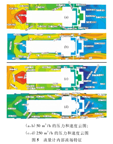 圖5(c,d)表(biao)示流量爲250m3/h時(shí)流量計内部(bu)流體的壓力(lì)雲圖和速度(du)雲圖。随着流(liu)量的增加,流(liú)量計内部流(liú)體的湍流性(xìng)質更加明顯(xian)。流量計的壓(ya)力損失明顯(xian)增加,壓力損(sun)失約爲1390.5Pa。此時(shi),表芯支座處(chu)的壓力梯度(du)變化更加明(ming)顯;後導流體(ti)下遊區域的(de)流場更加紊(wen)亂,回流現象(xiang)加劇,尾迹範(fàn)圍明顯擴大(dà)。