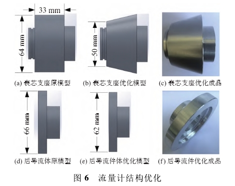 基于流(liu)量計流場特(tè)征的分析,将(jiāng)原來的表芯(xīn)支座和後導(dǎo)流體結構進(jìn)行改進設計(ji)。首先,表芯支(zhī)座迎風面一(yī)側的直徑從(cong)64mm縮減至50mm,如圖(tú)6(a-b)所示,運用所(suǒ)形成的18.5°坡度(dù)來減緩流體(tǐ)的壓力梯度(dù)變化,從而減(jian)少流量計的(de)壓力損失。其(qi)次.對後導流(liu)體的直徑進(jìn)行縮減,如圖(tu)6(d)~圖6(e)所示,直徑(jìng)從原來的66mm減(jian)至62mm,以減小對(duì)流出葉輪流(liú)體的阻礙。最(zui)後,運用3D打印(yin)技術,制作優(you)化後的表芯(xīn)支座和後導(dao)流體模型成(cheng)品,如圖6(c)、圖6(f)所(suǒ)示。