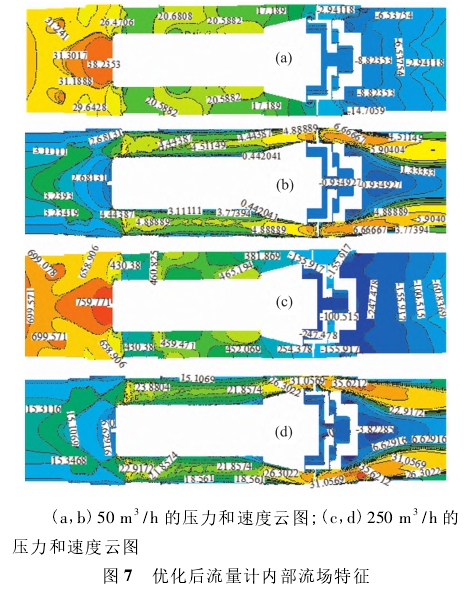 爲驗證改進(jìn)方案的可行(hang)性,對改進模(mo)型進行仿真(zhēn),從流場的角(jiǎo)度分析其優(you)化效果。流量(liàng)點同樣選取(qu)50m3/h、250m3/h作爲分析對(dui)象,流量計内(nèi)部流場特征(zheng)如圖7所示。從(cong)結構整體優(you)化的模拟結(jie)果可以看出(chū):由于改變了(le)表芯支座的(de)坡度使得氣(qì)流更加平緩(huǎn),其迎風面高(gāo)壓區減小,側(cè)面的負壓區(qu)消失,壓力梯(tī)度驟變的情(qíng)況得到緩解(jiě);後導流體下(xia)遊區域流場(chang)紊亂的現象(xiang)也得到明顯(xiǎn)改善,壓力分(fen)布變得更均(jun1)勻;尾迹區域(yu)的面積減小(xiǎo),尾迹耗散引(yǐn)起的能量降(jiang)低;流量計出(chū)口處的壓力(li)梯度變化更(geng)均勻,後導流(liu)體的導流效(xiào)果明顯提升(sheng);總壓,力損失(shi)明顯降低,在(zài)50m3/h流量點降低(dī)了約46.2%,在250m3/h流量(liàng)點降低了約(yue)45.8%。
