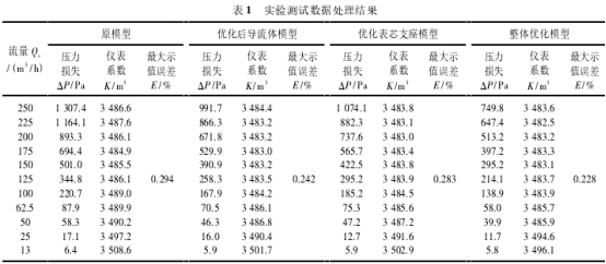 爲進一步驗(yan)證結構改進(jin)效果,用優化(huà)後的表芯支(zhī)座和後導流(liu)體成品模型(xing)代替原模型(xing)中的表芯支(zhi)座和後導流(liu)體結構,安裝(zhuāng)進氣體渦輪(lún)流量計進行(háng)實驗測試。根(gen)據《渦輪流量(liàng)計檢定規章(zhāng)》,通過重複實(shí)驗獲得多組(zu)實驗數據,數(shu)據處理後得(de)到流量計的(de)壓,力損失、儀(yí)表系數、最大(dà)示值誤差等(deng)性能指标,進(jin)而評價流量(liang)計的結構優(you)化效果及其(qí)計量性能。表(biǎo)1所示爲實驗(yan)測試的數據(ju)處理結果。