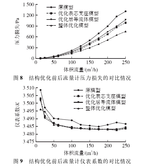 首(shou)先,對結構優(yōu)化前後流量(liang)計壓力損失(shi)的實驗結果(guo)進行分析。圖(tu)8表示原模型(xing)、優化表芯支(zhī)座模型、優化(huà)後導流體模(mo)型,以及整體(ti)優化模型的(de)壓力損失随(sui)着流量變化(huà)的規律。随着(zhe)流量的增大(da),所有流量計(jì)模型的壓力(li)損失均呈明(míng)顯增大趨勢(shi)。兩個結構優(yōu)化方案均對(dui)壓力損失的(de)降低起到了(le)作用,當流量(liàng)爲250m3/h時,整體優(you)化模型将壓(ya)力損失降低(di)至.749.8Pa,降低幅度(dù)約42.6%,有效地減(jiǎn)少流量計在(zai)使用過程的(de)能耗,提高了(le)流量計的性(xìng)能。
