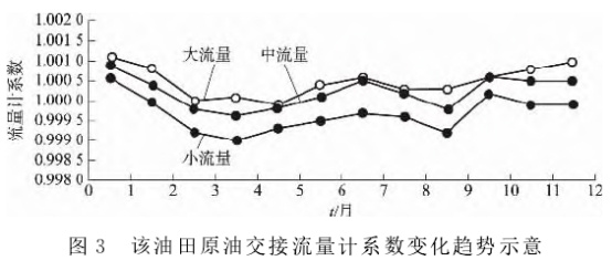 以該油(yóu)田原油交接(jiē)小、中、大流量(liàng)運行狀況爲(wei)例,流量計系(xì)數變化趨勢(shi)如圖3所示。由(you)圖3看出,中流(liú)量運💋行狀況(kuang)最優。說明該(gai)流量計日常(cháng)運行流量與(yǔ)檢定時的流(liu)🏃量保持一緻(zhì),變化最優。