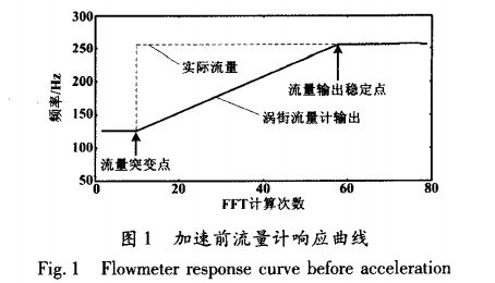 采用頻(pin)譜估計方(fāng)法分析渦(wo)街信号的(de)頻率是基(ji)于渦街流(liu)量計信号(hao)是一個平(píng)穩随機過(guò)程信号,并(bing)且流量在(zai)短時間内(nei)是穩定的(de)或變化很(hěn)小。由于渦(wo)街流量計(jì)輸出信号(hao)實時性的(de)要求,隻能(néng)對有限長(zhǎng)時間段内(nèi)的信号進(jìn).行處理,即(ji)隻能截取(qǔ)一段數據(ju)進行頻譜(pu)分析。爲了(le)防止數據(jù)統計變異(yì)性對計算(suàn)渦街頻率(lǜ)的影響,必(bi)須對若幹(gàn)次頻譜分(fen)析的結果(guǒ)進行平均(jun),這就需要(yao)花費時間(jian)。當平均次(cì)數多時,數(shù)字渦街流(liú)量計的響(xiang)應速度就(jiu)會顯得比(bi)較慢。例如(ru),我們的系(xi)統采用時(shí)鍾頻率爲(wei)40MHz的TMS320LF2407ADSP芯片,使(shi)用彙編語(yu)言編制FFT程(cheng)序計算渦(wō)街信号的(de)頻譜,對50次(ci)計算結果(guo)進行平均(jun1)。每次FFT計算(suan)時間大概(gai)是300ms(包括信(xin)号處理,人(rén)機接口等(děng)對應的其(qí)他軟件執(zhi)行時間),總(zǒng)用時大概(gài)爲15s,這個時(shi)間比較長(zhang)。若在這段(duan)時間裏,流(liu)量發生突(tū)然變化,系(xì)統就需要(yào)計算50次FFT,才(cái)能反映流(liu)量的變化(huà),這将造成(cheng)測量誤差(cha),如圖1所示(shì)。