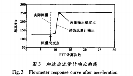 圖3爲經過(guò)加速處理(li)後40口徑渦(wō)街流量計(ji)在流量突(tū)變時的響(xiǎng)應曲線。可(ke)見,在流量(liàng)突變後,系(xì)統經過3次(ci)FFT計算就能(neng)跟上流量(liang)的變化,有(you)效地提高(gāo)了流量計(ji)的響應速(sù)度。